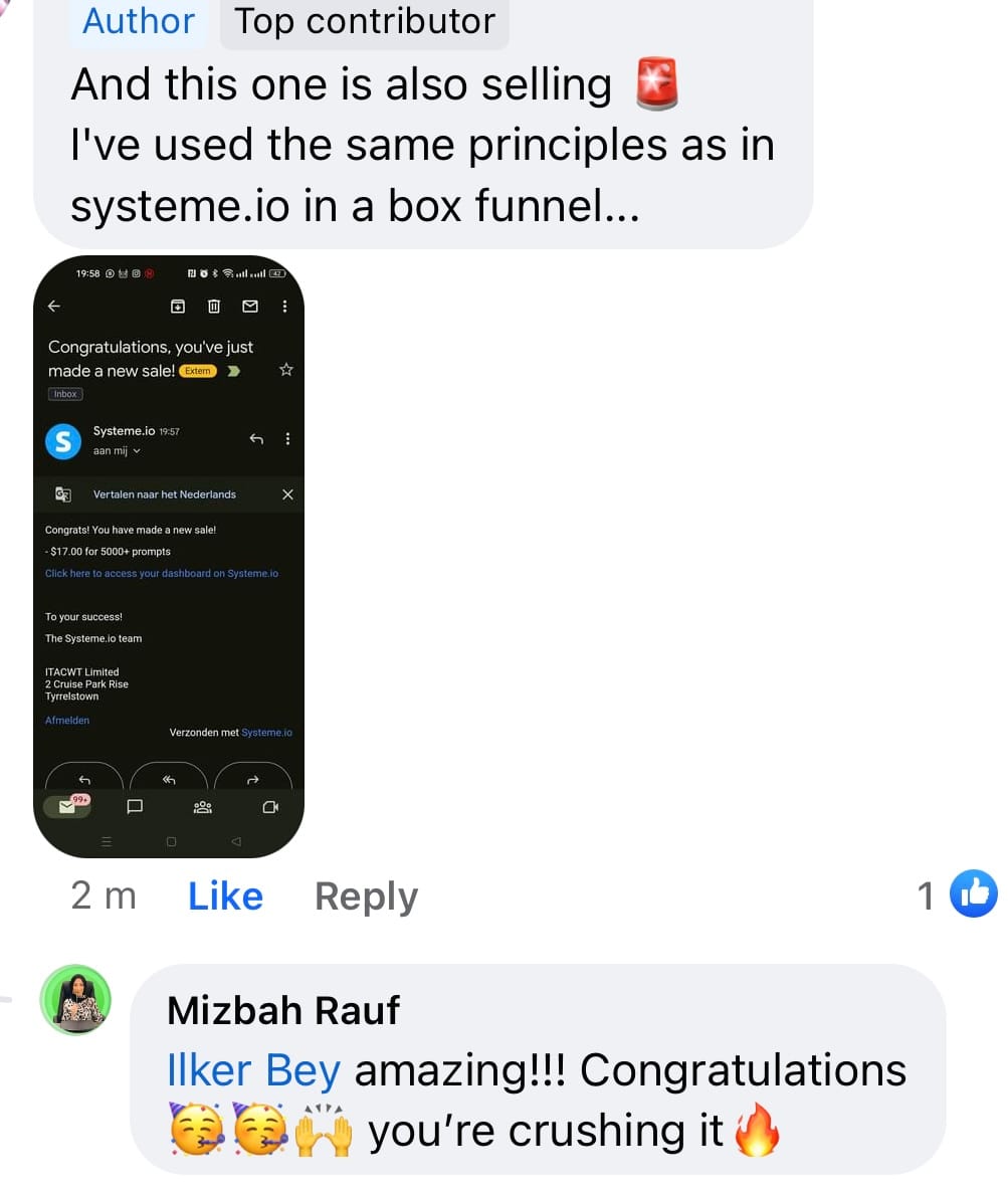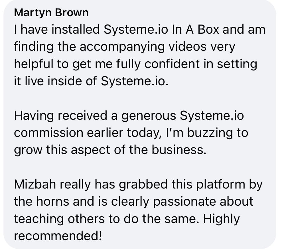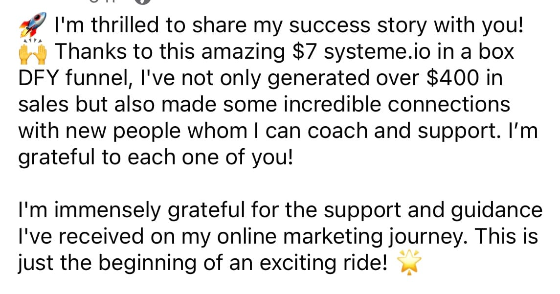 One Student used Systeme.io In A Box. After just a few hours, she launched a $7 low-ticket funnel with a $27 order bump, $97 upsell, and an affiliate offer page, and says it’s already helping her make sales on autopilot while growing her customer list.