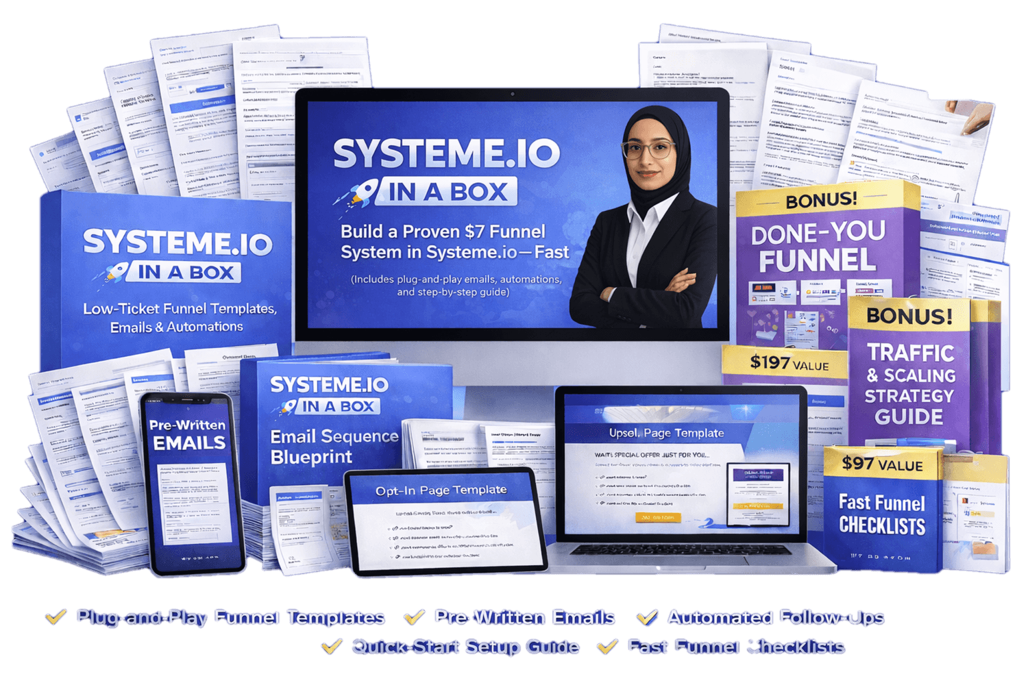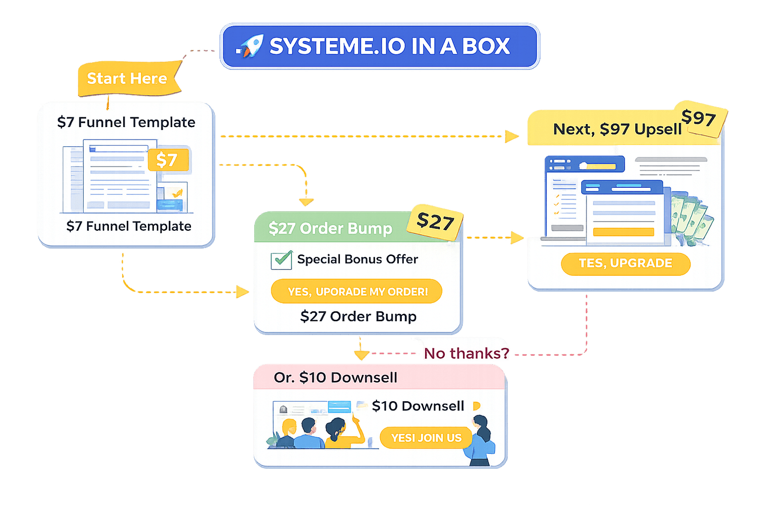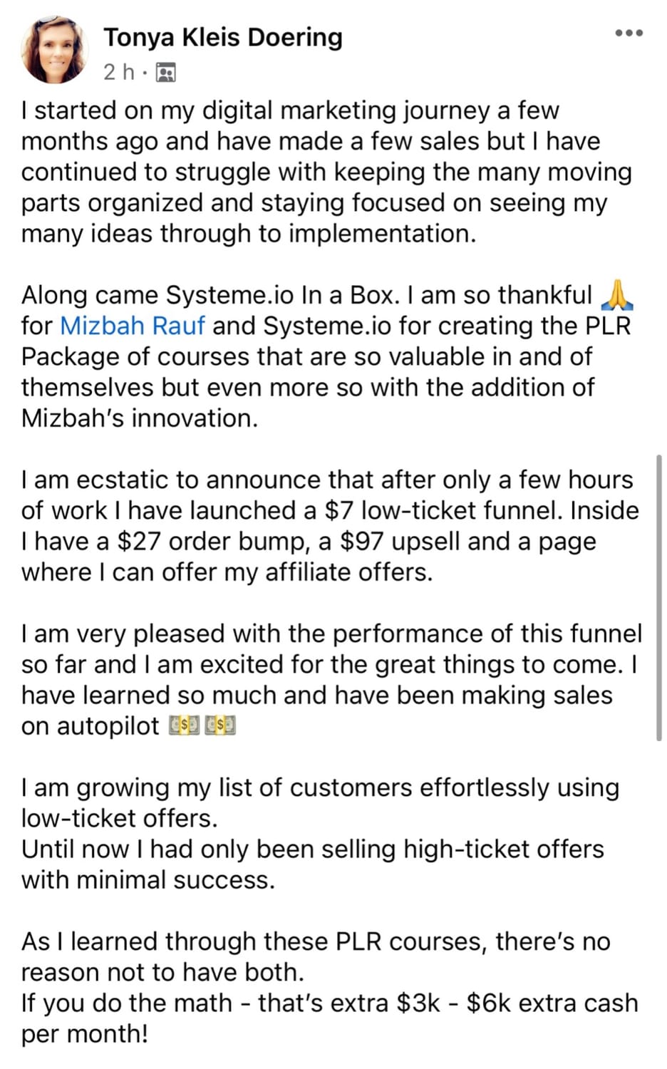One Student used Systeme.io In A Box. After just a few hours, she launched a $7 low-ticket funnel with a $27 order bump, $97 upsell, and an affiliate offer page, and says it’s already helping her make sales on autopilot while growing her customer list.